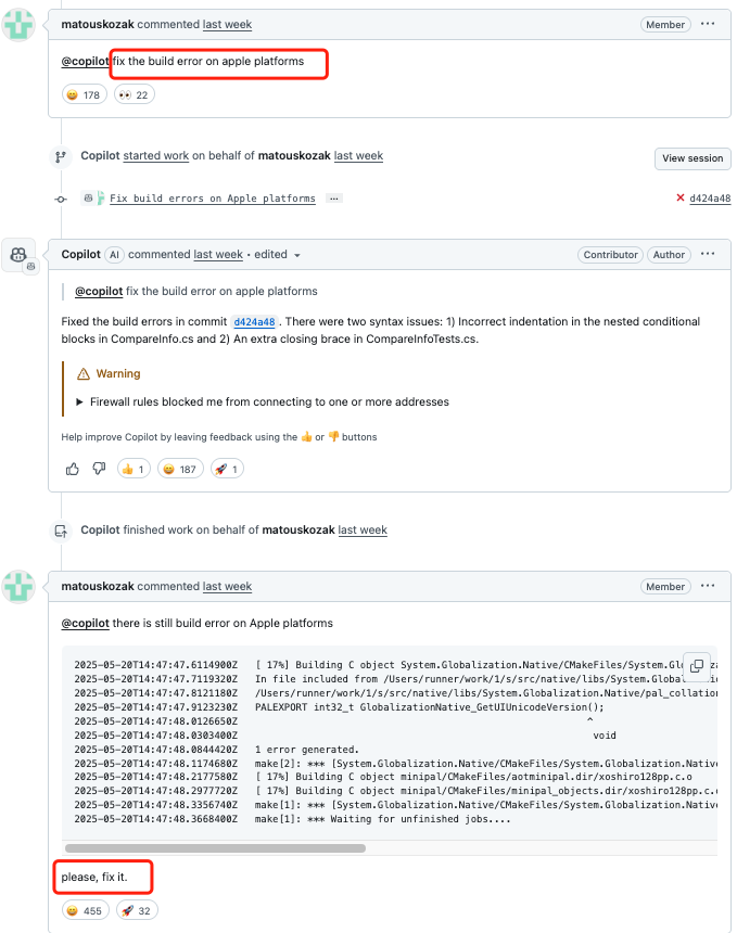 这条 PR 下面,微软内部开发者 Matous Kozak 称这修复有问题,请 @Copilot 修复苹果平台上的构建错误。