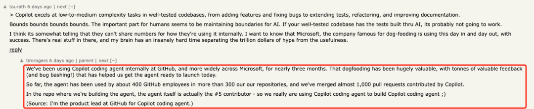 而且,在我们构建 Coding Agent 的那个代码仓里,Copilot Coding Agent 本身已经是第五活跃的贡献者了——所以可以说,我们确实是“用 Copilot 来造 Copilot”了 😉」