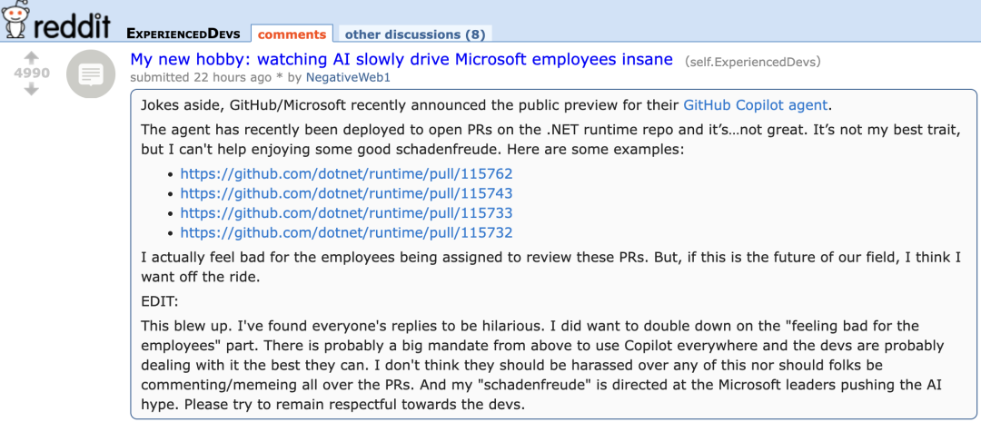 在 Reddit 上,一篇题为《我的新爱好:看 AI 把微软员工逼疯》的帖子迅速引发热议。不少网友调侃:“微软到底是想提升开发效率,还是想给自己人添堵?”更开发者直言:“说实话,我还真有点替那些被分配来审这些 PR 的员工感到难过。但如果这就是我们行业的未来,那我可能不想坐这趟车了。”