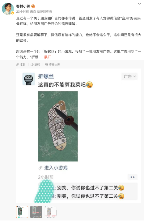 近日,有关于“微信盗用好友资料给朋友圈广告写评论”的传闻在网络上引发热议。5 月 22 日,腾讯微信事业群员工“客村小蒋”账号通过微博公开回应,表示微信没有这样的能力,也绝不会这么干。据“客村小蒋”所述,这些评论均来自用户真实操作,只是部分用户时间久了忘记了自己的评论行为。同时,同一游戏投放了一系列广告,不同时间点用户刷到的广告也不尽相同,进一步加深了误解。