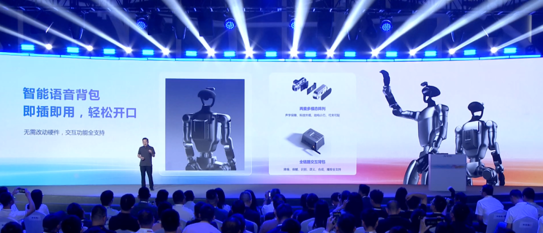 为了展示这款“语音背包”的互动效果,在发布会现场,讯飞特别选择了其合作伙伴——宇数科技的 G1 机器人作为示范对象。