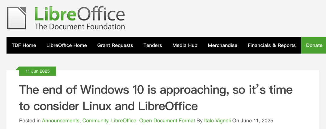 譬如 LibreOffice 基金会就在官网高调发文——《Windows 10 即将结束,是时候考虑 Linux 和 LibreOffice 了》。