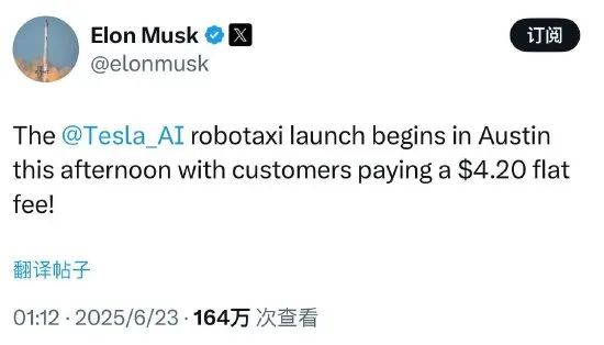 特斯拉无人出租车服务 RoboTaxi 在得州低调启动,马斯克称“固定收费 4.2 美元”