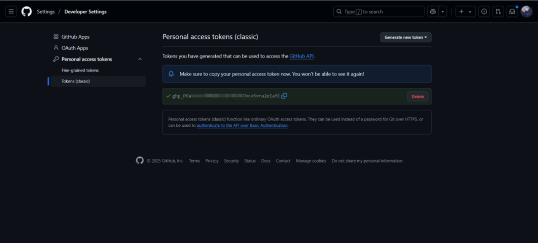 1. 登录 GitHub,依次点击右上角头像 → Settings → Developer settings → Personal access tokens → Tokens (classic)。