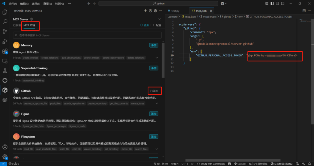 3. 安装 GitHub MCP 插件,并将刚刚获取的 Token 粘贴进配置文件;