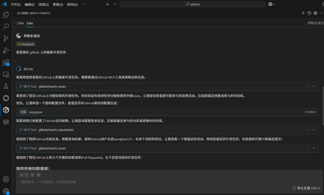 5. 你可以直接对 GitHub MCP 发起自然语言指令,比如“查看当前 issue”、“提交修改”、“创建 PR”——所有动作将被自动执行。