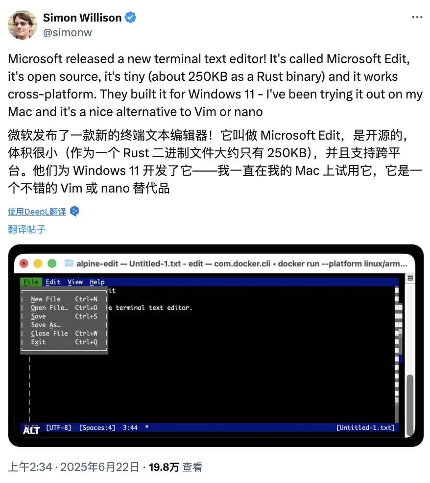 独立 AI 研究员 Simon Willison 也在 X(前 Twitter)上分享了自己的试用体验:“微软发布了一个全新的终端文本编辑器!它叫 Microsoft Edit,是开源的,Rust 编写,编译后体积只有 250KB,并且支持跨平台。我在 Mac 上试了一下,是个不错的 Vim 或 nano 替代品。”