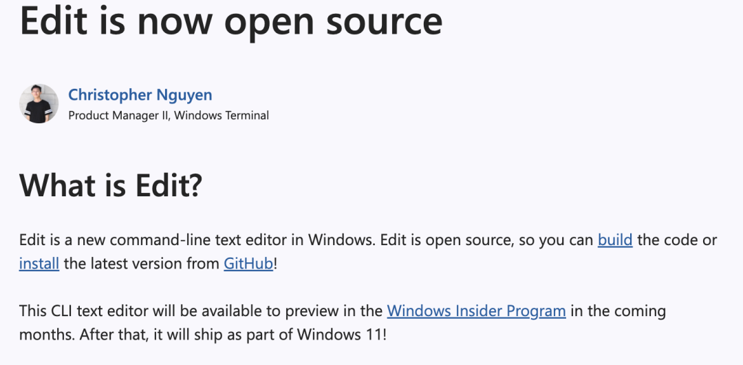 对此,微软 Windows 终端产品经理 Christopher Nguyen 还专门撰写了一篇名为《Edit 现已开源》的文章,介绍该项目背后的背景与设计思路。