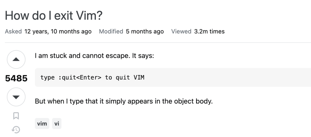 这个问题并不是段子而已,早在多年前,就有用户在 Stack Overflow 上郑重其事地发帖询问“如何退出 Vim”。
