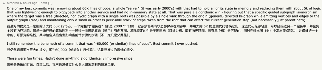 “我做过最棒的一次提交,是直接删掉了大约 6 万行代码。那是一个早期服务器项目(2000 年代初),所有状态全都要保存在内存里,复杂又脆弱。