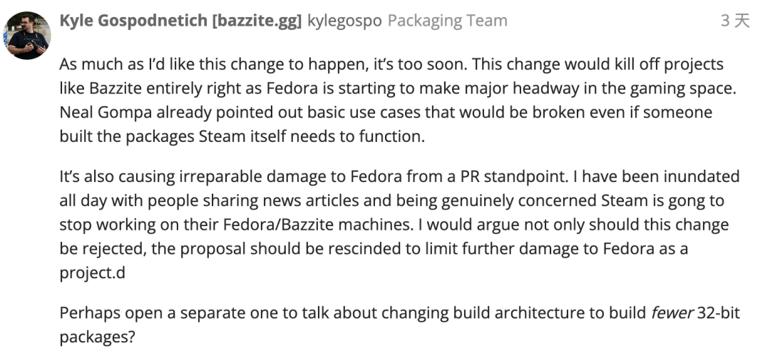尽管我非常希望这个变更最终能够落地,但现在还为时过早。如果现在就执行,等于直接扼杀了像 Bazzite 这样的项目 —— 正值 Fedora 在游戏领域刚刚取得重大进展的时候。Neal Gompa 已经指出,即使有人手动构建了 Steam 所需的软件包,很多基础用例依然会失效。