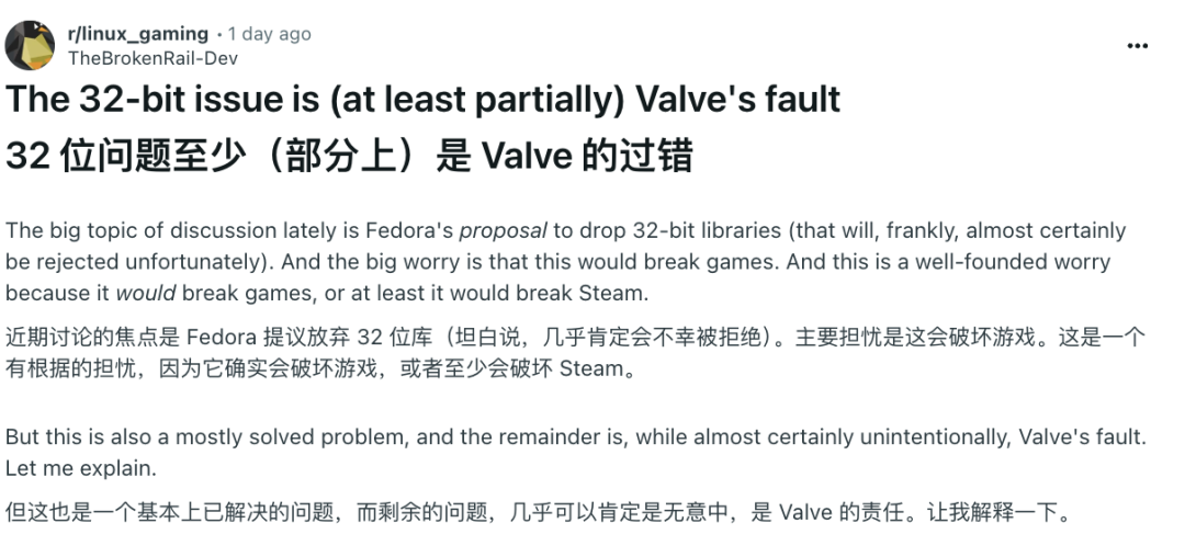 与此同时,也有不少网友将矛头指向 Steam 后面的开发商 Valve。一位网友在 Reddit 上发表评论称:“32 位问题(至少部分)要怪 Valve。”