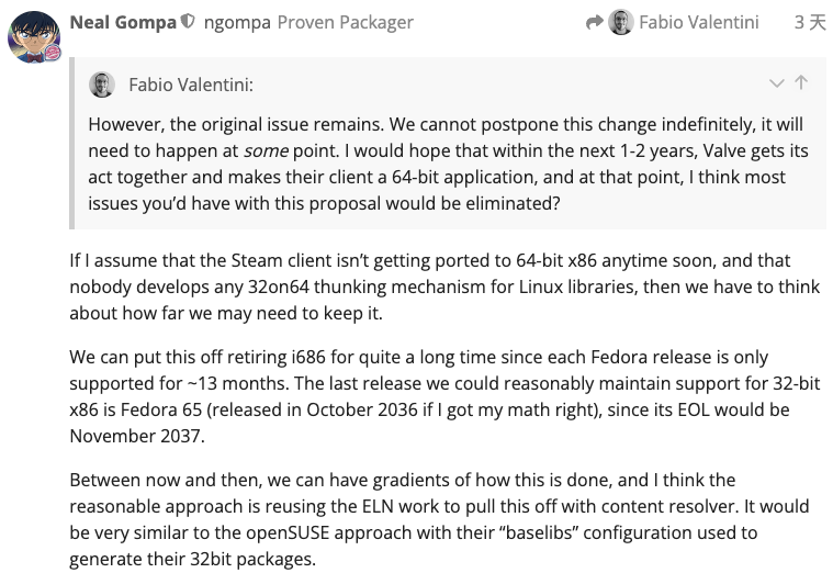 要知道,目前还有不少老游戏、Steam 应用都还依赖这些 32 位组件。对此,甚至有一款基于 Fedora 打造、专为游戏玩家设计的 Linux 发行版 Bazzite 创始人直言:如果 Fedora 最终真的砍掉 i686 支持,自家的项目可能会被迫停摆,这对他们来说无异于一次“灭顶之灾”。