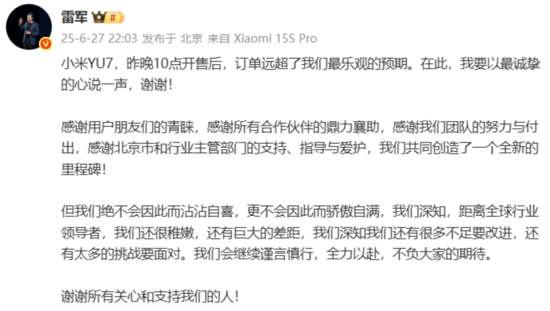 6月27日晚,小米CEO雷军发文,称小米YU7昨晚10点开售后,订单远超了最乐观的预期。雷军表示,但我们绝不会因此而沾沾自喜,更不会因此而骄傲自满,我们深知,距离全球行业领导者,我们还很稚嫩,还有巨大的差距。
