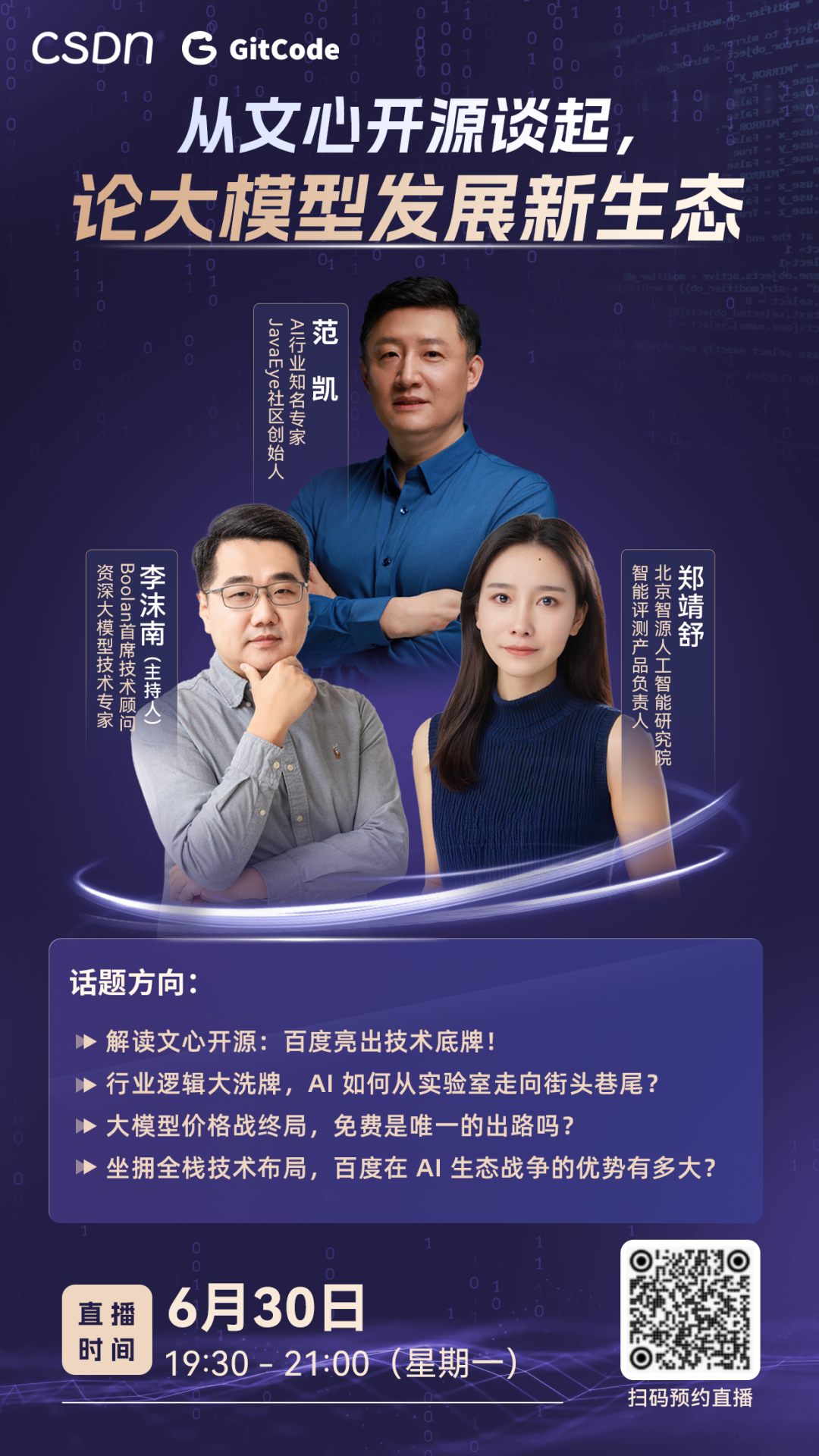 就在今晚 7:30,优快云 针对百度此次大手笔开源,邀请到了 AI 行业知名专家范凯,北京智源人工智能研究院智能评测产品负责人郑靖舒,Boolan 首席技术顾问、资深大模型技术专家李沫南围绕文心大模型开源、行业发展趋势等进行深度解读: