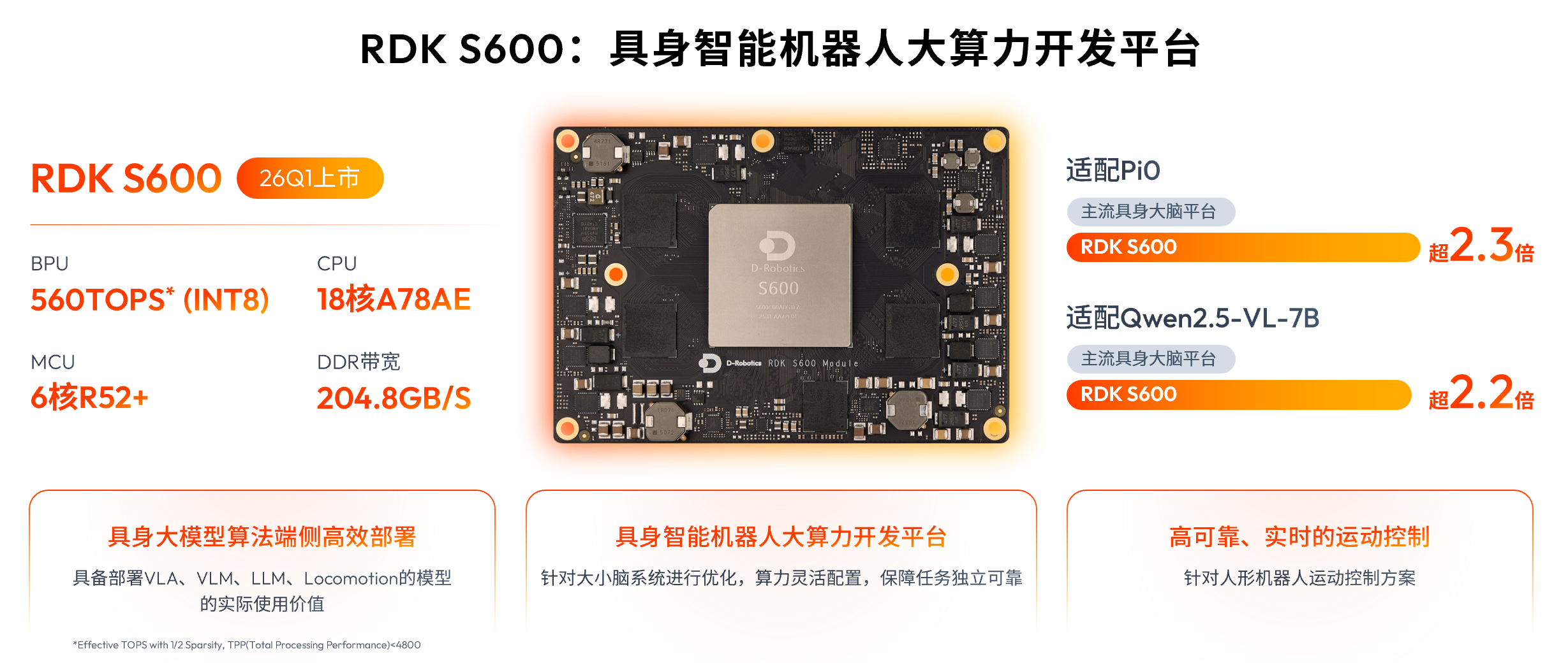此次前瞻亮相的S600作为地瓜机器人的旗舰级具身智能机器人大算力开发平台,拥有560 TOPS*(INT8) 算力,采用高效灵活的大小脑架构设计并进行了深度优化。其大脑配置18核A78AE CPU和全新BPU Nash,可支持VLA、VLM、LLM、Locomotion多种具身大模型算法端侧高效部署,尤其是在适配Pi0、Qwen2.5-VL-7B时,性能分别超越主流具身大脑平台2.3倍和2.2倍,满足复杂决策需求;小脑配置6核R52+ MCU,专为人形机器人优化,具备高可靠、实时的运动控制能力。