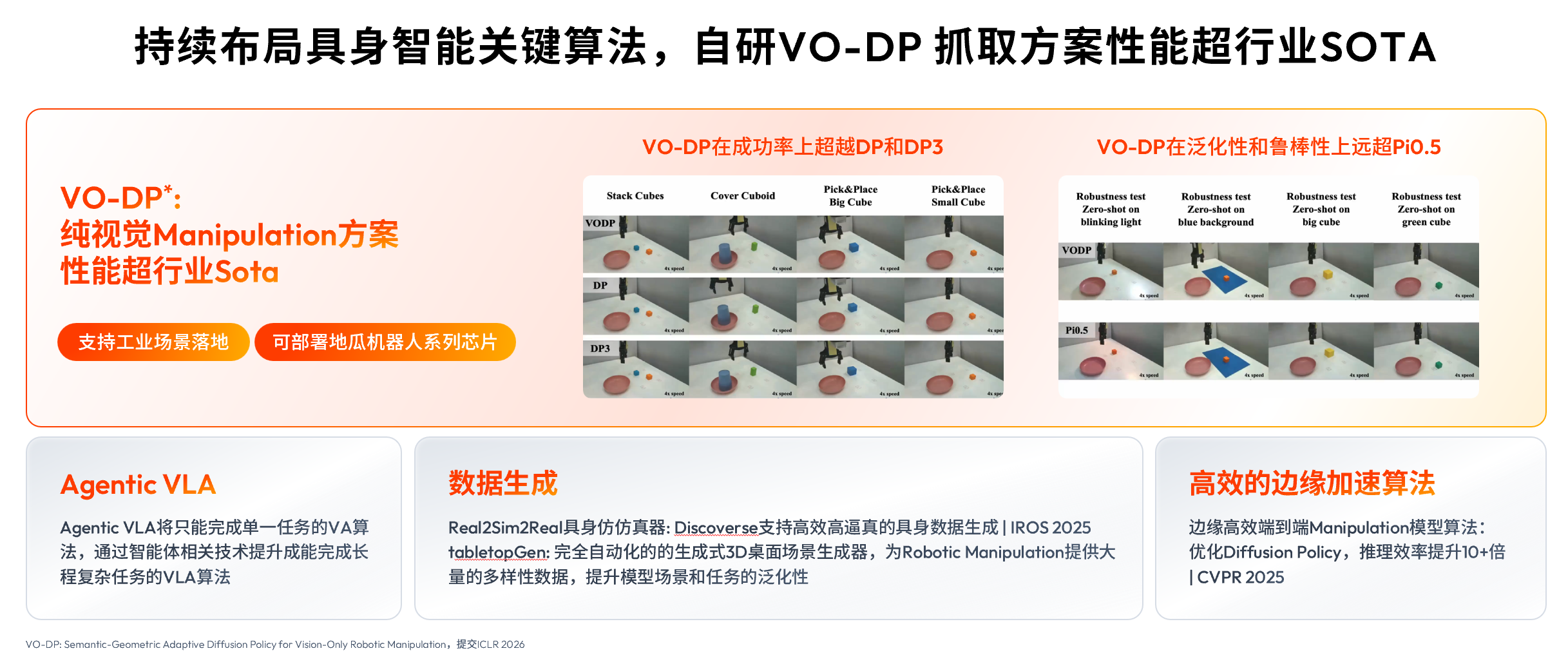 地瓜机器人在前沿算法领域亦不断创新,与端侧智能计算平台软硬结合,帮助客户和开发者实现先进算法在端侧的高效部署。例如,地瓜机器人自研的双目算法SOTA指标行业领先,以精度媲美激光雷达的双目Depth、避障性能达到智能驾驶级别的双目OCC、业界首个多双目全景Occupancy感知方案高阶段Omni-OCC方案,持续赋能机器人客户产品落地。地瓜机器人持续布局具身智能关键算法,自研的VO-DP纯视觉Manipulation抓取方案性能超行业SOTA,成功率超越DP和DP3、泛化性和鲁棒性远超Pi0.5,达到工业场景的应用要求。