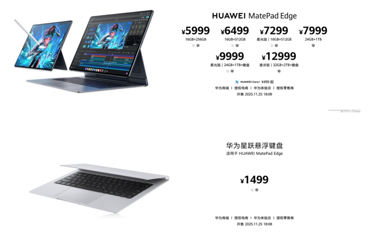 售价方面,华为MatePad Edge售价5999元起,于2025年11月25日18:08在华为商城、授权电商、华为体验店和授权零售商同步上市。华为星跃悬浮键盘售价1499元,2025年11月25日同步开售。华为星跃随行键盘售价999元,将于2025年12月12日开售。