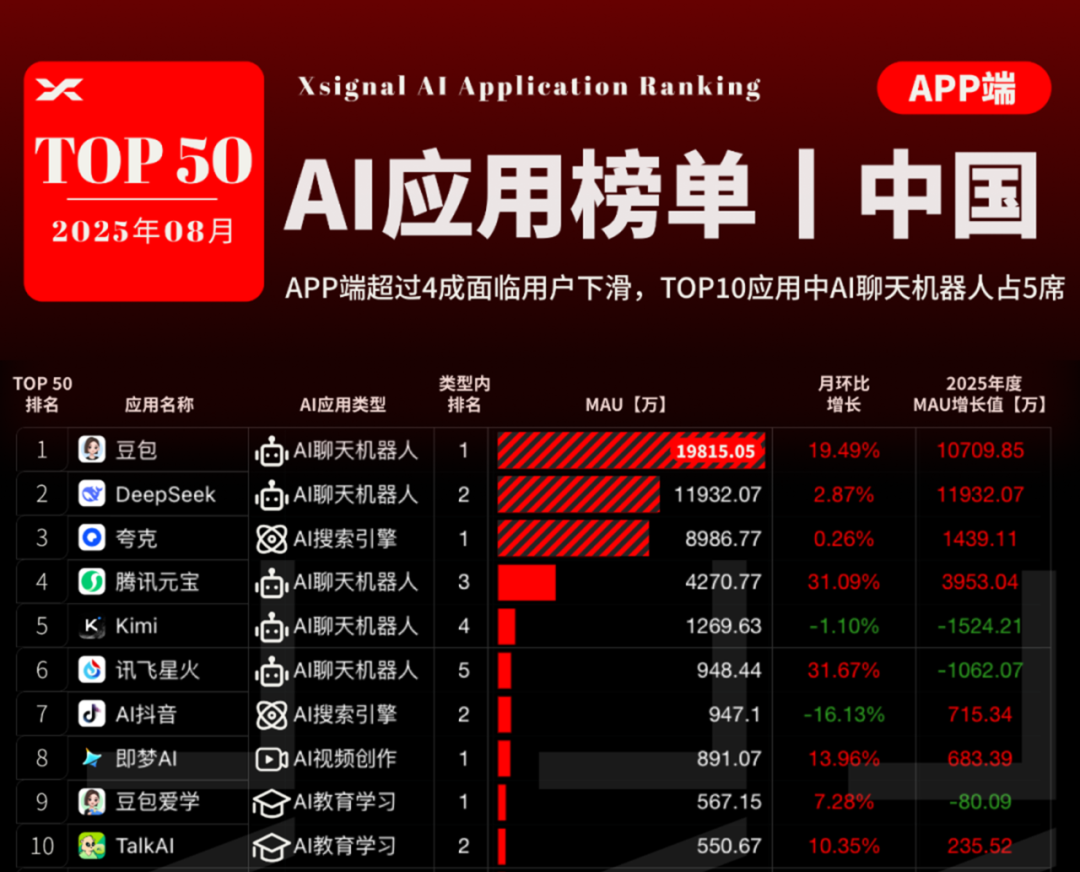 纵观各大移动应用榜单,头部位置长期被字节跳动、腾讯等互联网巨头占据。以国内AI应用为例,字节旗下的“豆包”凭借强大的流量灌溉,长期霸占下载榜和活跃榜首位。
