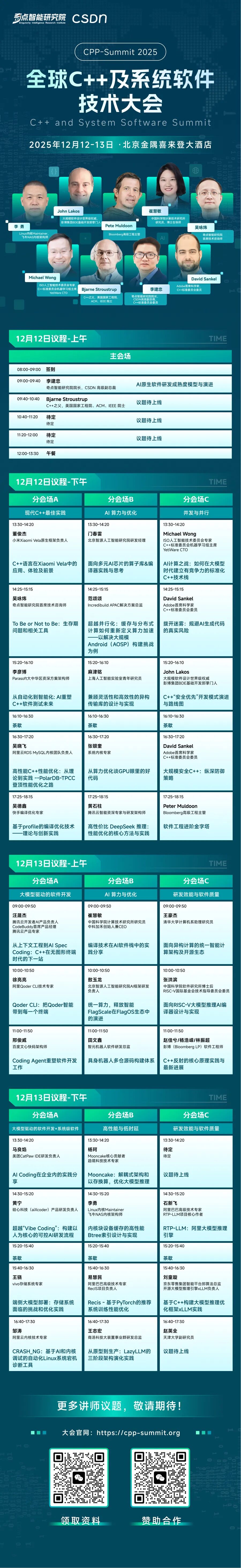 12 月 12–13 日,由 优快云 与奇点智能研究院联合举办的「2025 全球 C++ 及系统软件技术大会」将在北京隆重举行,届时,C++ 之父 Bjarne Stroustrup、优快云 高级副总裁,奇点智能研究院院长李建忠、ISO AI 技术委员会专家、C++ 标准委员会机器学习组主席 Michael Wong 等全球顶尖系统专家将齐聚一堂,共同探讨这系统软件与 AI 原生时代下的,软件研发与工程实践的最新进展与实践。