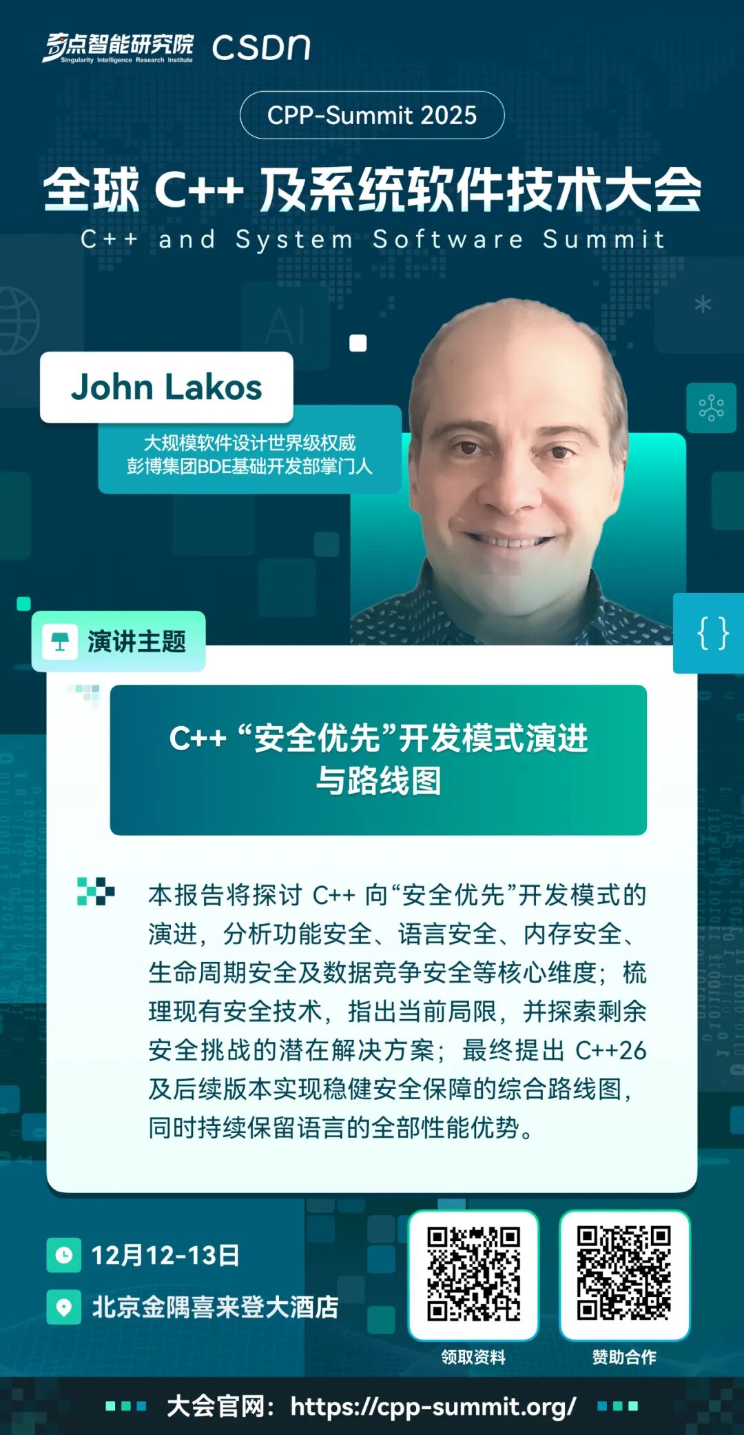 在金融世界里,有这样一位被誉为“大规模软件设计领域的世界级权威”工程师、彭博集团(Bloomberg LP) BDE 基础开发部掌门人、C++ 标准委员会负责标准库工作组的资深委员、世界级 C++ 组件化开放权威 John Lakos 将在 2025 全球 C++ 及系统软件技术大会上带来《C++ 安全优先开发模式演进与路线图》主题演讲。
