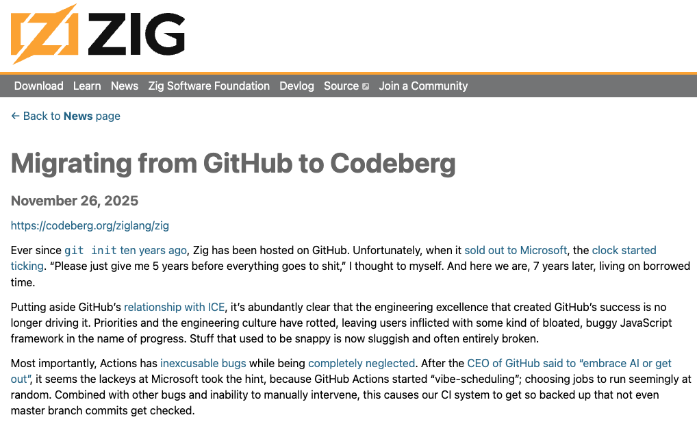 就在这样的背景下,一股新的“迁徙潮”悄悄兴起:越来越多的开发者开始将开源项目从 GitHub 迁移到了其他平台,其中既有轻量级浏览器、游戏模拟器项目,也包括像 Zig 这样的知名编程语言项目。