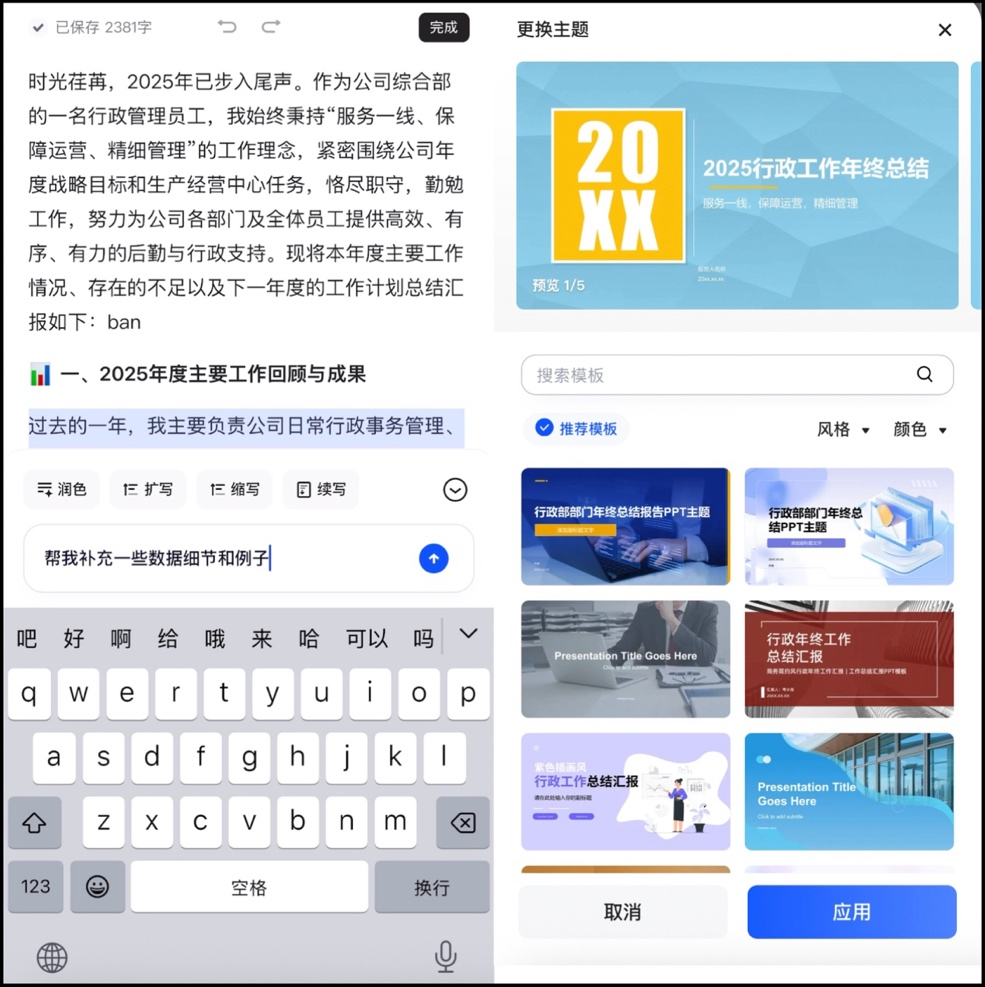 千问的智能编辑器支持更多精细化操作。对于文档,用户不仅可对文字直接删改,更能调用AI能力对特定段落进行润色、扩写或风格调整。对于PPT内容,用户也可直接通过对话调整大纲与正文内容,以及一键智能更换模版。除了生成、编辑、格式调整外,千问还支持Word/PPT/PDF/Excel等各类格式转换,确保用户相关操作在一个APP里就能完成。