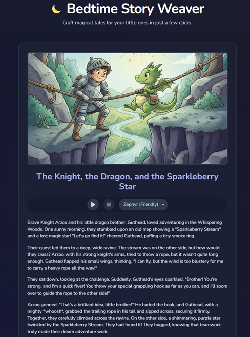 Bedtime Story Weaver 网站搭成后,他儿子先让它生成了一个“龙和骑士的冒险故事”,配图也色彩丰富、画风温和,Jonathan Menkes 在一旁看着也觉得没啥问题: