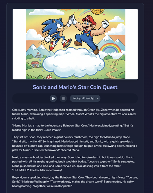 他儿子随手敲几个字,Google 的 AI Studio 就迅速生成了一个功能完整的网站,能够自动讲故事、配插图,还能立即把索尼、任天堂、迪士尼等大厂的版权角色混在一起冒险。