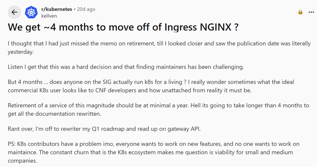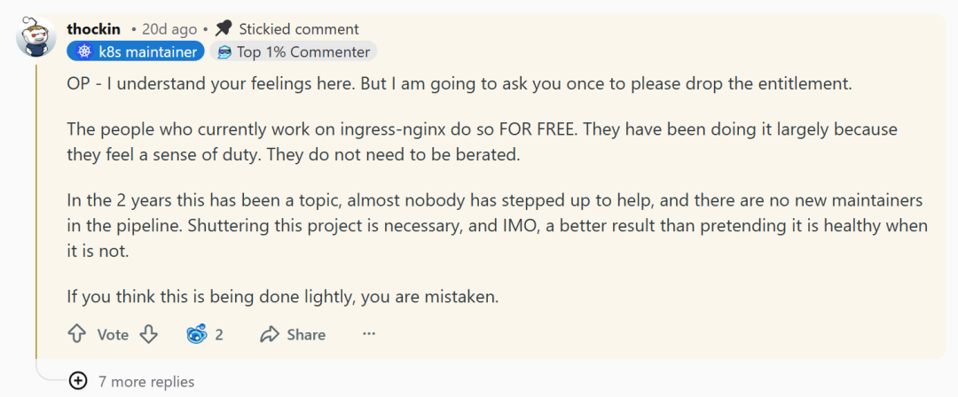 “请不要带有理所当然的态度。维护 Ingress NGINX 的人都是免费做这件事,靠责任感在支撑。这两年来几乎没人愿意加入维护工作,关闭项目是必然的。”
