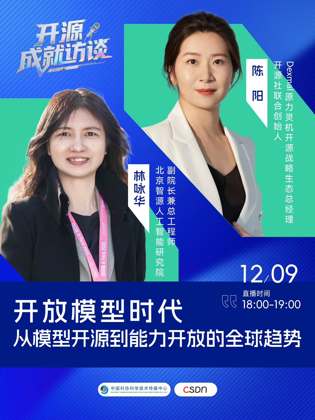 12月9日18:00,《开源成就访谈》首期节目即将播出!我们特邀北京智源人工智能研究院副院长兼总工程师林咏华,与开源社联合创始人,Dexmal原力灵机开源战略生态总经理陈阳展开深度对谈,共同探讨开放模型时代,从模型开源到能力开放的全球趋势。