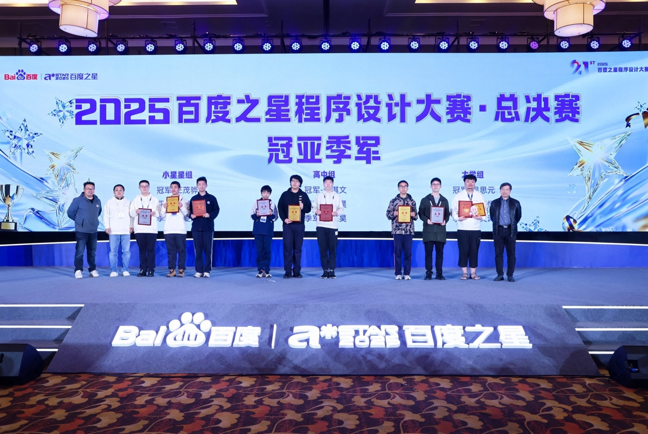 12月8日,据百度公众号发文,被称为编程界“奥斯卡”的2025百度之星程序设计大赛(以下简称“百度之星”)决赛于12月7日晚在北京圆满收官。超千名选手在决赛现场展开激烈角逐,当晚,百度公布最终成绩,来自烟台青华中学的王茂骅获得小星星组冠军并斩获总冠军,清华大学程思元获大学组冠军,南京外国语学校许淇文获高中组冠军,各组优胜选手将累计获得10万元奖金。