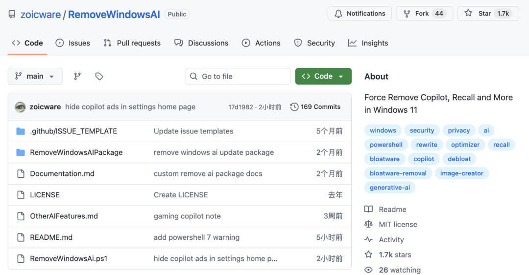 一名开发者忍无可忍下,干脆自己动手写了一个脚本,将其取名为 RemoveWindowsAI,并在 GitHub 上开源出来(https://github.com/zoicware/RemoveWindowsAI)。这个项目的目的非常直接:尽可能地把 Windows 11 系统里面所有与 AI 相关的东西,包括 Copilot、Recall 在内的各种组件,统统一键禁用掉。