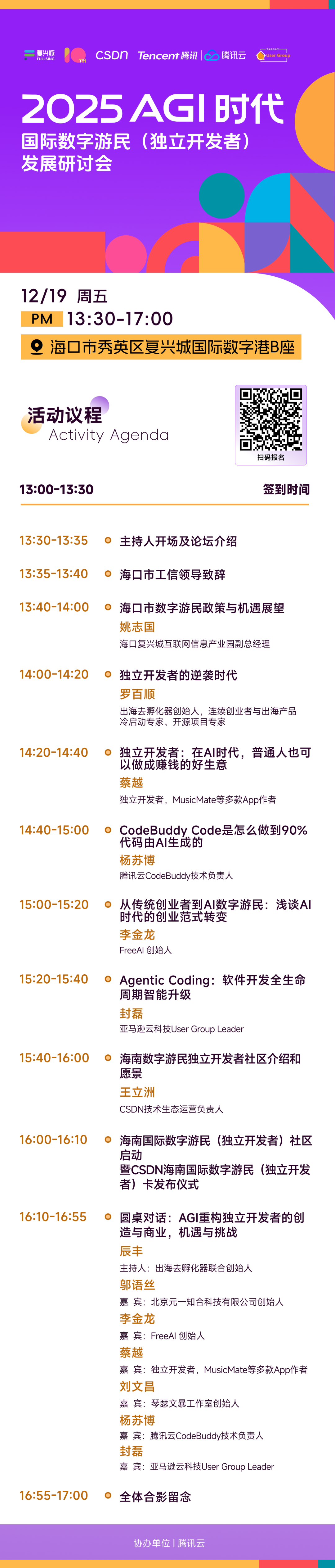 ● 生态与连接层面:研讨会中将正式启动 “海南国际数字游民(独立开发者)社区” 并介绍和发布专属身份卡,旨在构建长期支持体系。最后的圆桌对话 “AGI重构独立开发者的创造与商业,机遇与挑战” ,将汇聚多方视角,深入探讨机遇与挑战。