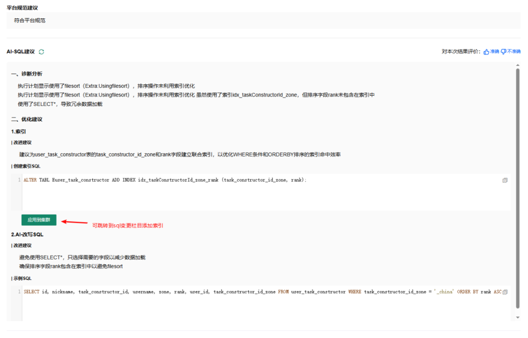 AI提供索引建议和SQL改写建议,一键跳转ODC数据变更界面。