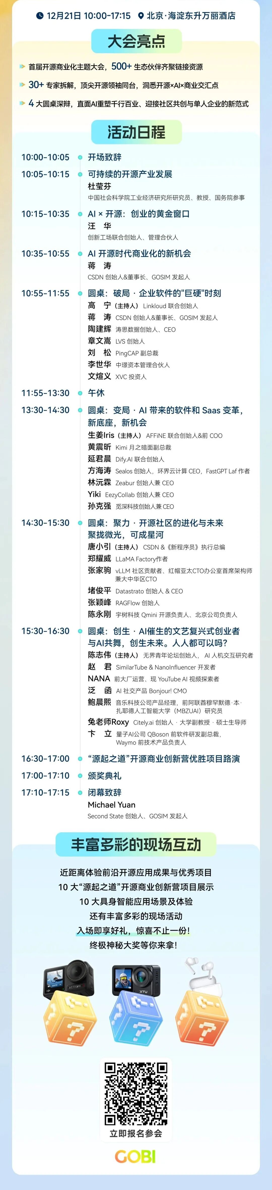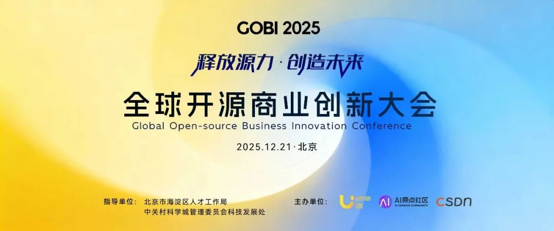 为了系统性地探寻答案,GOBI 2025 全球开源商业创新大会将于12月21日在北京盛大启幕。我们坚信,只有将“开源、商业、AI”这三股关键力量汇聚于同一场域,让最顶尖的大脑进行最前沿的思想交锋,才能真正洞见未来,找到穿越周期的那条正确路径。