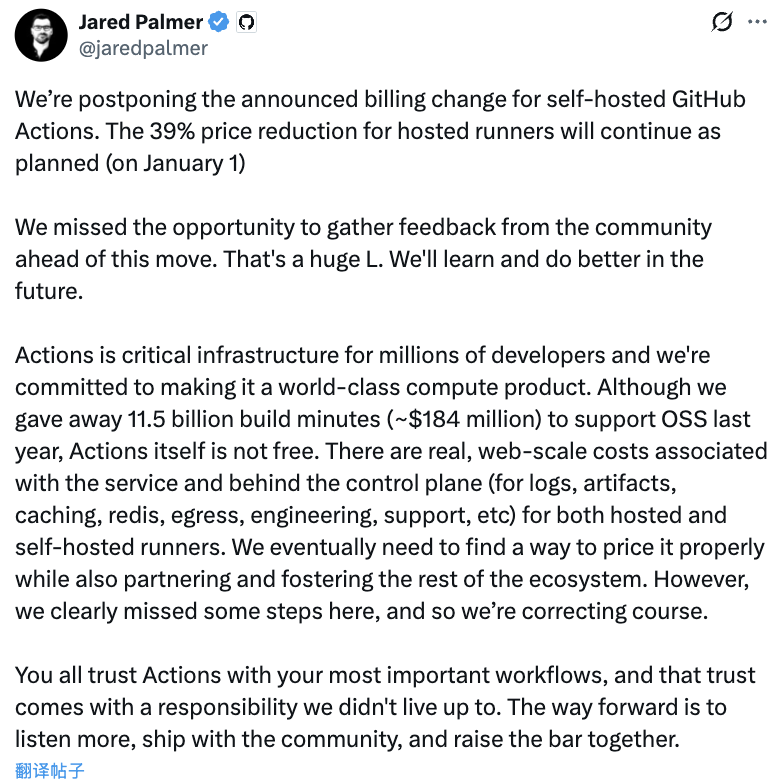 「我们将推迟此前宣布的自托管 GitHub Actions 计费变动。不过,托管 runner 的 39% 降价仍将按计划生效(1 月 1 日)。