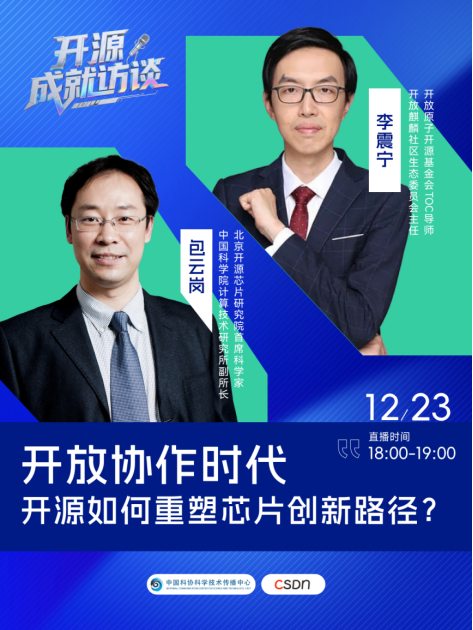 12月23日18:00,《开源成就访谈》特邀中国科学院计算技术研究所副所长,北京开源芯片研究院首席科学家包云岗,与开放麒麟社区生态委员会主任,开放原子开源基金会 TOC导师李震宁展开深度对谈,开放协作时代,开源如何重塑芯片创新路径?