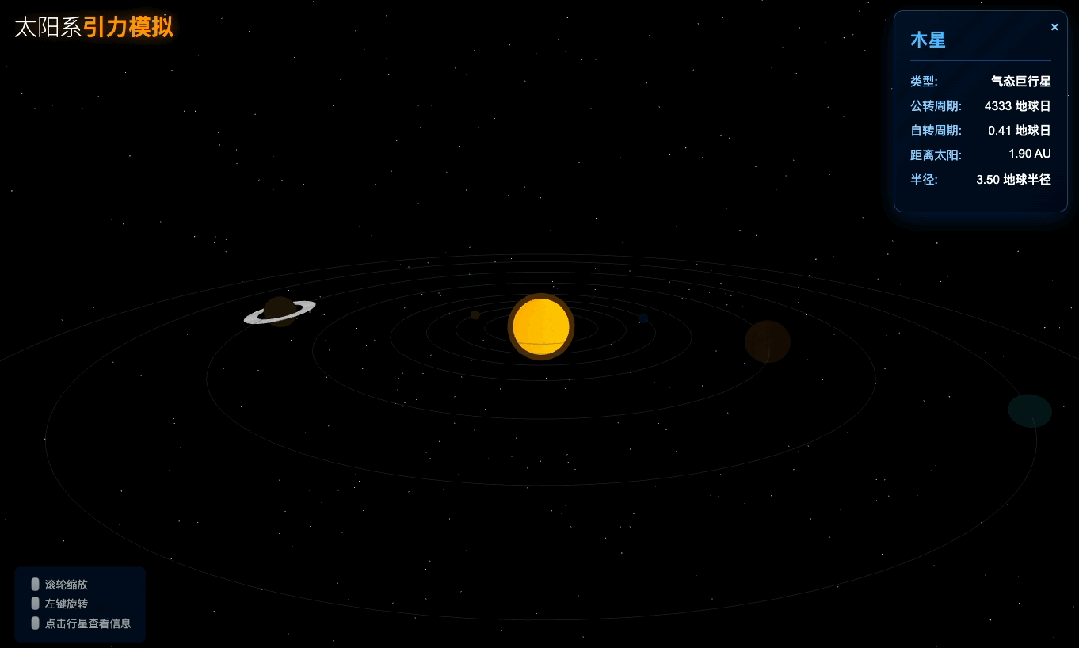 这绝不是写几个 CSS 动画画个圆那么简单。我要求它必须在浏览器里从零手搓一个微型物理引擎:彻底抛弃预设动画,严格基于牛顿万有引力公式实时计算天体轨迹;不仅要处理三维空间中的向量运算来实现公转与自转的力学闭环,还要搞定复杂的 Raycasting(光线投射) 算法来实现 3D 交互——鼠标拖拽旋转、滚轮无级缩放、点击行星精准反馈。这哪里是考代码,分明是在考它能不能把高等数学和天体力学完美翻译成 JavaScript。