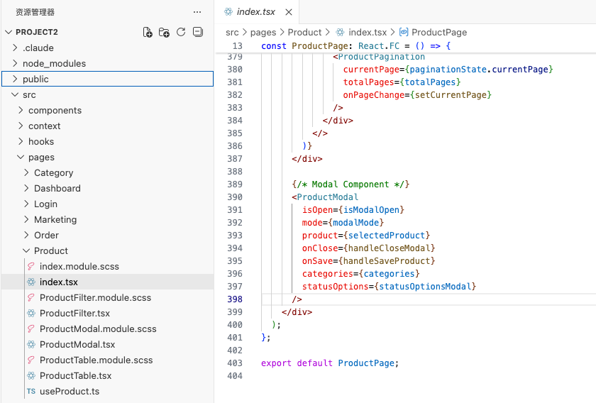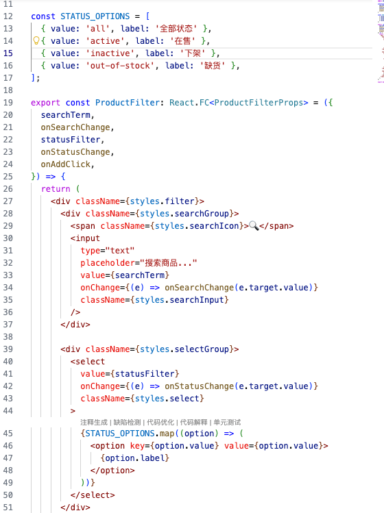 视图层的细节也没掉链子。生成的 ProductFilter 子组件拒绝了偷懒的行内样式,选用了严谨的 CSS Modules 方案。文件头部显式定义了 Props 接口,彻底告别了 any 类型这种埋雷行为。