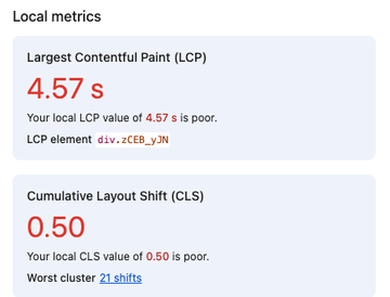 现状可谓惨烈:本地实测 LCP(最大内容绘制)高达 4.57 秒,这意味着用户打开页面后要盯着白屏发呆近 5 秒;CLS(累积布局偏移)高达 0.50,代表页面元素在渲染时像疯了一样乱跳,想点个按钮结果它自己跑了。更致命的是,由于 useEffect 里存在闭包陷阱,定时器从未被正确清除,浏览器内存占用曲线走出了一条惊悚的“上扬线”。