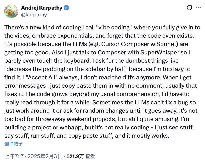 2025 年是 AI 实现突破的一年——它可以只用英文指令就生成各种令人印象深刻的程序,几乎不用理会代码本身。有趣的是,我第一次提出“vibe 编程”这个术语,是在一条随手灵感发的推文里,当时完全没想到它会发展得这么远。