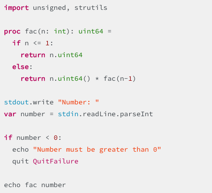 Objeck 某种程度上象征了 Java 原本应该发展成的样子。下面是使用 Objeck 编写的一个程(Objeck 语言内有一个内置的阶乘函数,但这个例子中是一个自定义的函数):