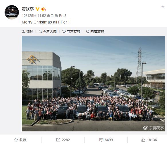 昨天,一年一度的圣诞节来临之际,贾跃亭在微博发文庆祝的同时晒出了一张疑似 Faraday Future (国内常译为法拉第,简称 FF)未来所有员工及设备厂房的照片,照片中所有人环绕在 7 辆车周围,似乎宣告 FF91 造车计划正常进行。