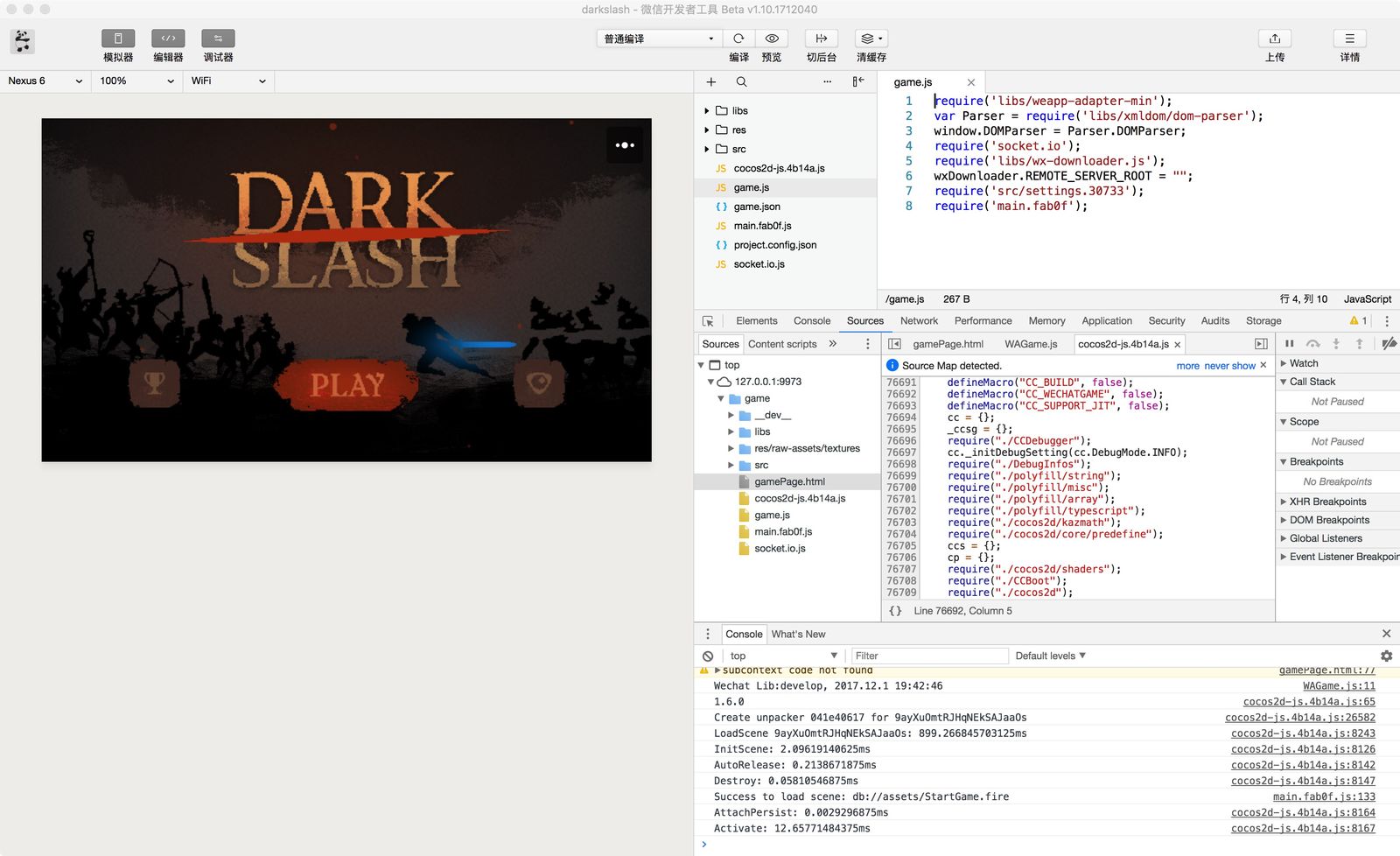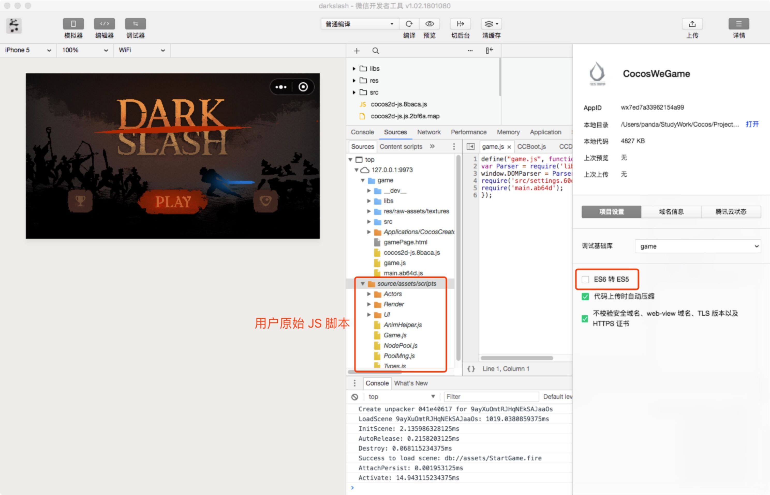 对于依赖 HTML5 游戏库或基础模块,在开发者工具中直接编写代码的开发者来说,这样的开发体验其实是足够的。不过很多开发者都会使用游戏引擎来开发游戏,可能会遇到问题。以 Cocos Creator 为例,开发者打包过程中引擎会将游戏代码压缩为单一文件,如果选择发布模式,还会进一步混淆并合并代码。这样就会导致调试过程中无法正确使用原始用户脚本进行调试,会加大调试的难度。