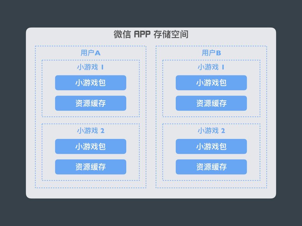 首先,微信内将小游戏的文件存储空间按照用户和游戏来划分。所有文件系统接口,都是在独立的文件沙盒环境中执行,所有的文件目录也是相对于沙盒环境的,所以不用担心不同小游戏或者不同用户之间的文件冲突。