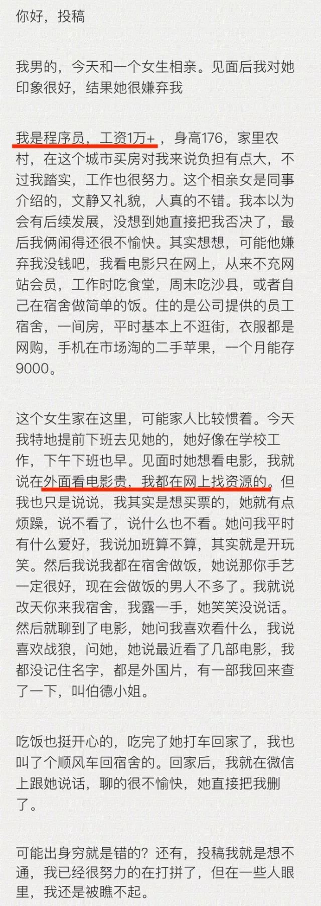 事情起源于“上海全知道”收到的一篇网友投稿,这名程序员网友讲述了自己的一次相亲经历。具体是这样的:
