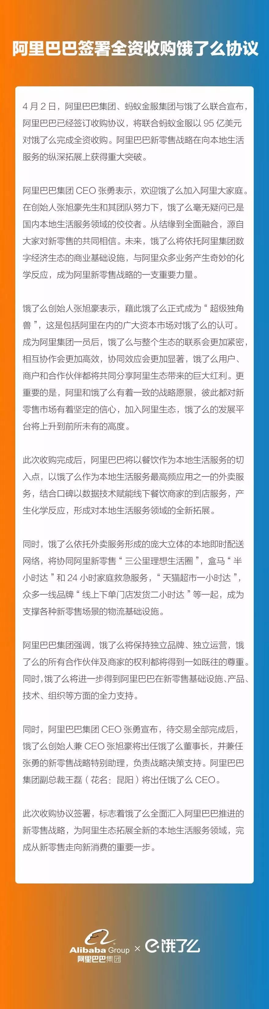 阿里巴巴集团 CEO 张勇表示,“热烈欢迎饿了么正式成为阿里巴巴大家庭的一员。饿了么和阿里生态的完全结合,标志着我们从新零售走向新消费的重大进展。”