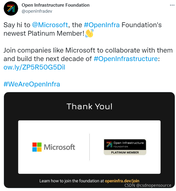 2021 年 9 月 7 日,OpenInfra 开放基础设施基金会宣布已与微软签署合作协议,即日起,微软正式成为基金会白金会员,未来双方将通过开源项目社区共同推进包括混合云和 5G 在内的开放基础设施。