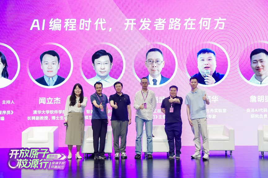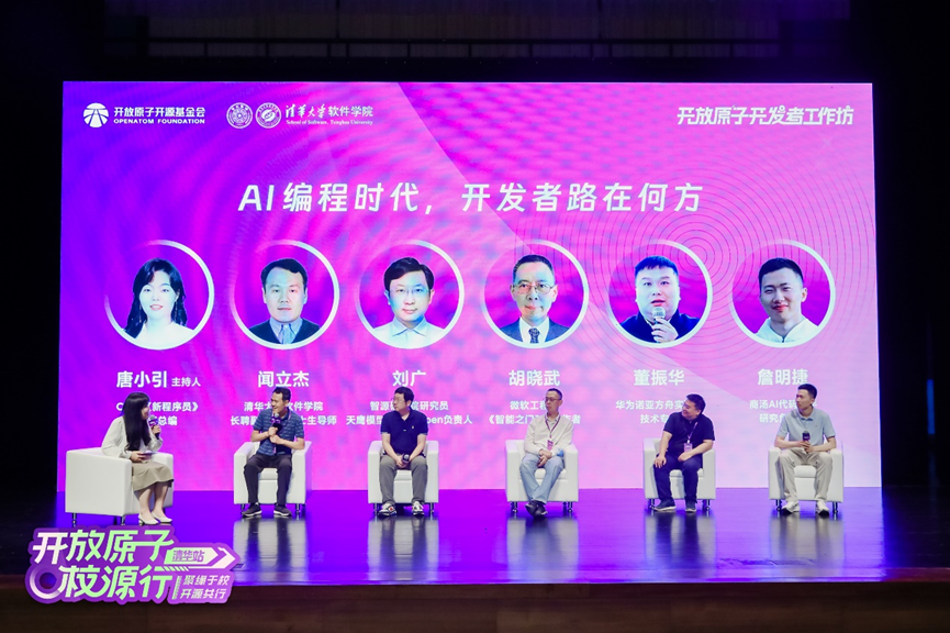 6月28日,在2023年开放原子校源行(清华大学站)活动特别设置的“开放原子开发者工作坊”环节里,齐聚清华大学软件学院长聘副教授、博士生导师闻立杰,华为诺亚方舟实验室技术专家董振华,微软工程师、《智能之门》主要作者胡晓武,智源研究院研究员、天鹰模型及FlagOpen负责人刘广,商汤AI代码助手研究负责人詹明捷五位技术大咖,在优快云《新程序员》执行总编唐小引主持下,围绕《AI编程时代,开发者路在何方?》的话题展开精彩对话,帮助开发者厘清思路。